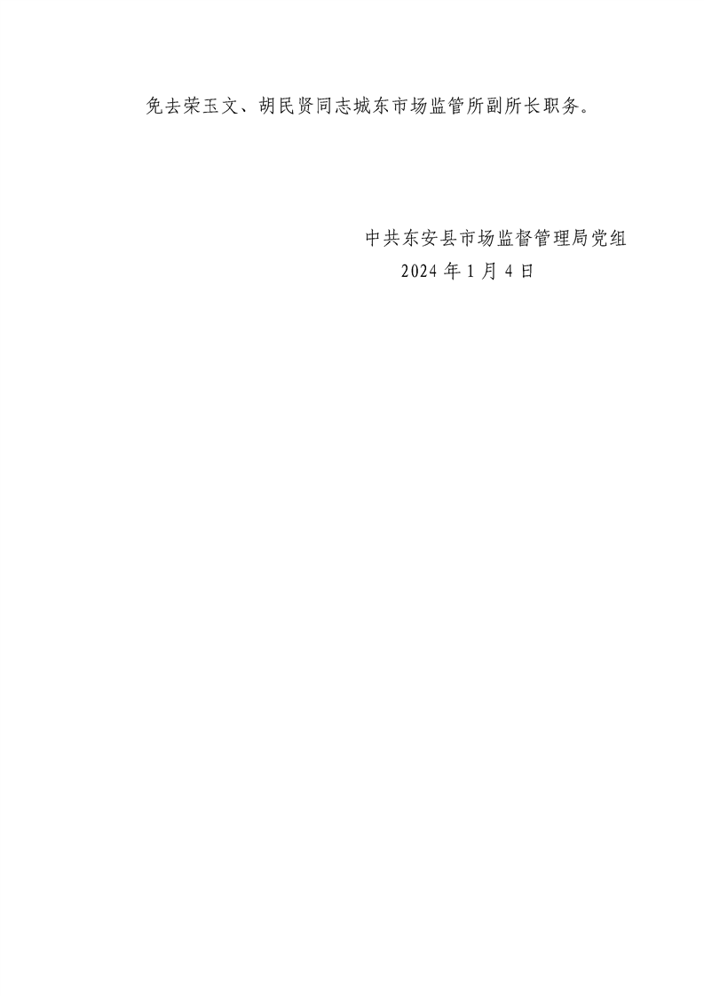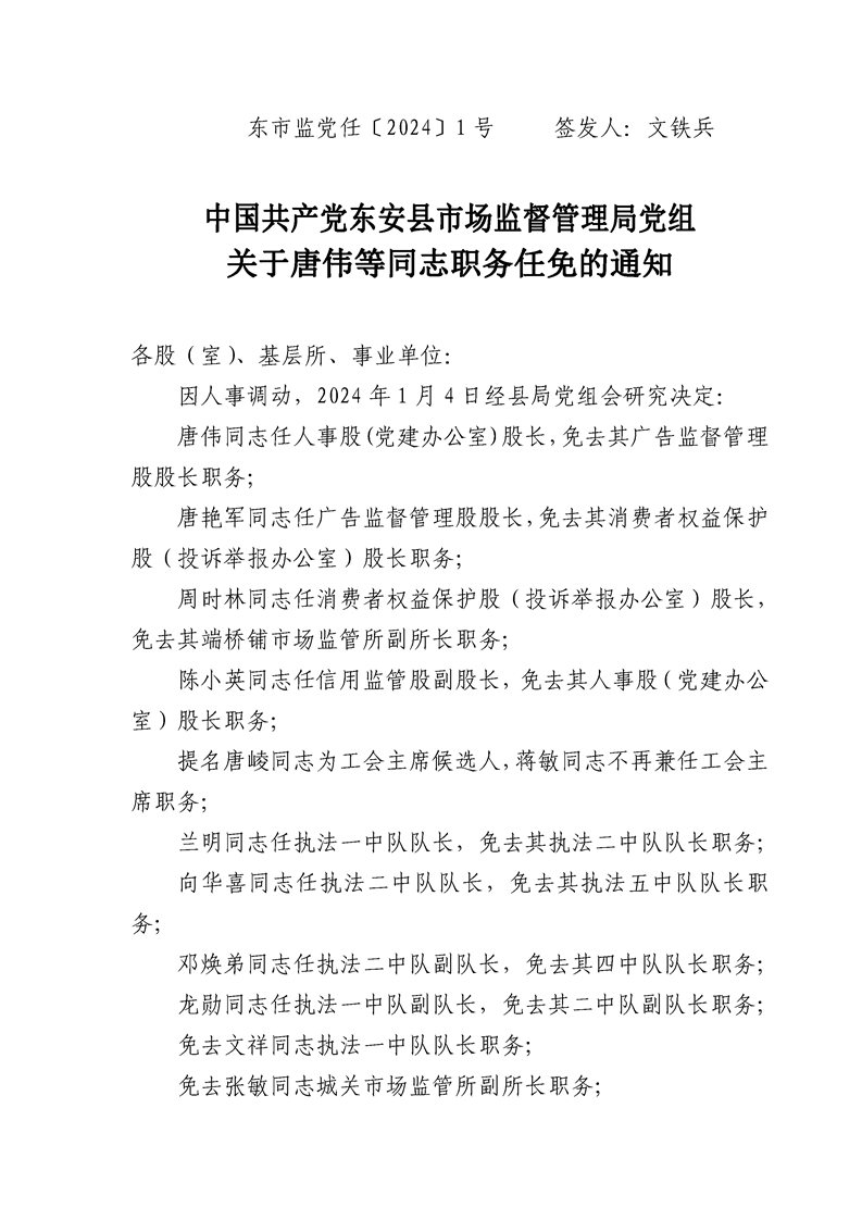 名称: 东市监党任〔2024〕1号 中国共产党东安县市场监督管理局党组关于唐伟等同志职务任免的通知