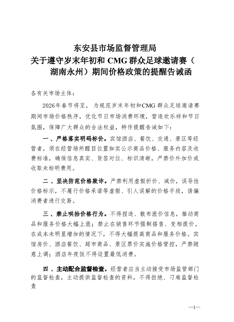 东安县市场监督管理局关于遵守岁末年初和 CMG 群众足球邀请赛(湖南永州)期间价格政策的提醒告诫函