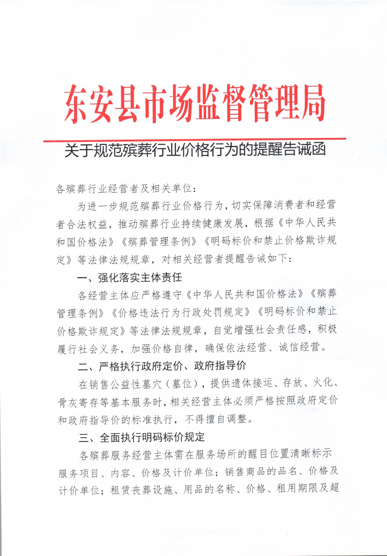 东安县市场监督管理局关于关于规范殡葬行业价格行为的提醒告诫函