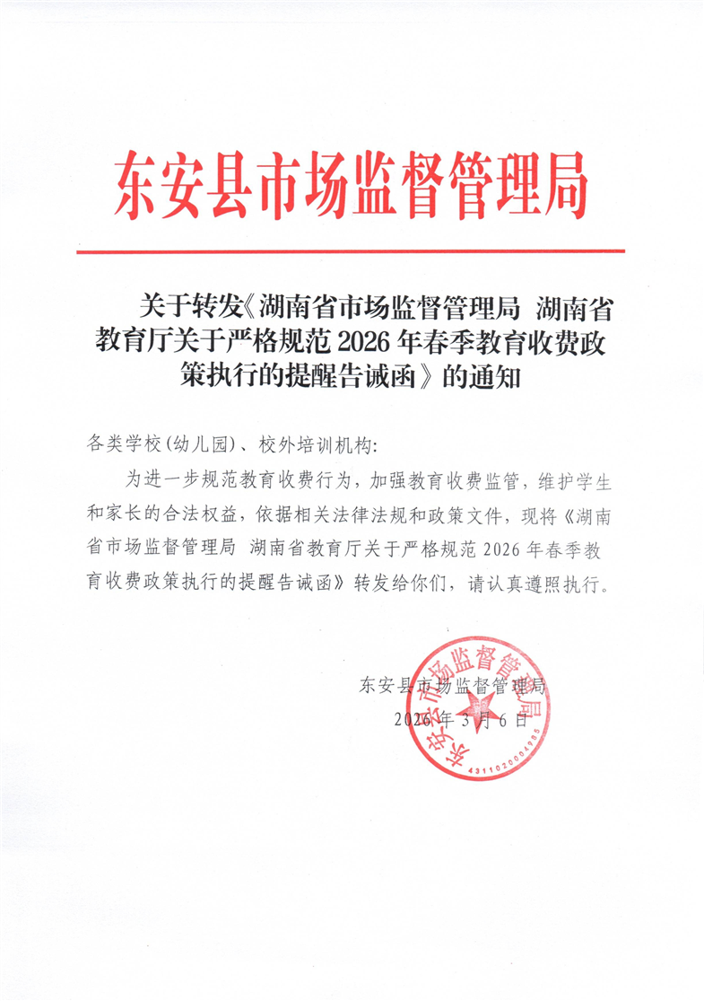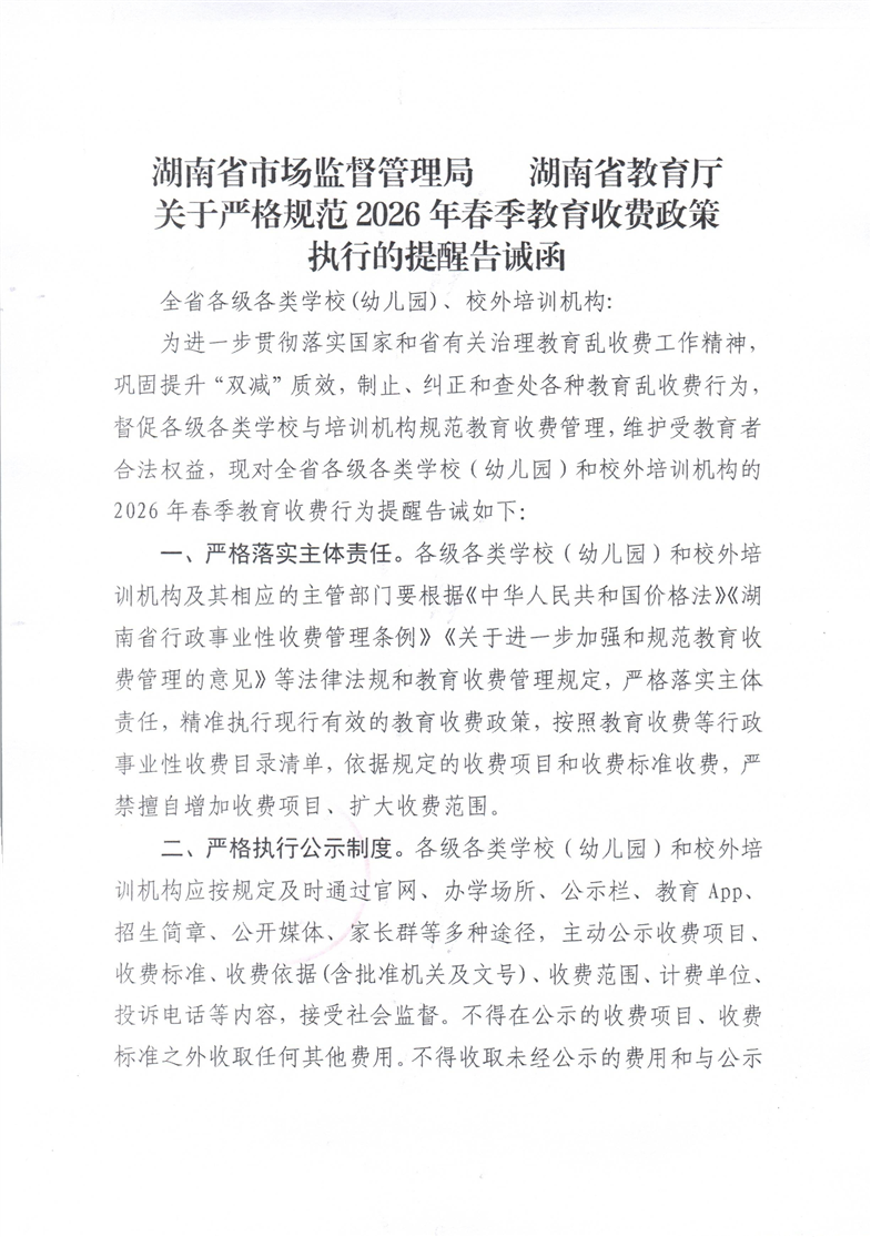 湖南省市场监督管理局湖南省 教育厅关于严格规范2026年春季教育收费政策执行的提醒告诫函