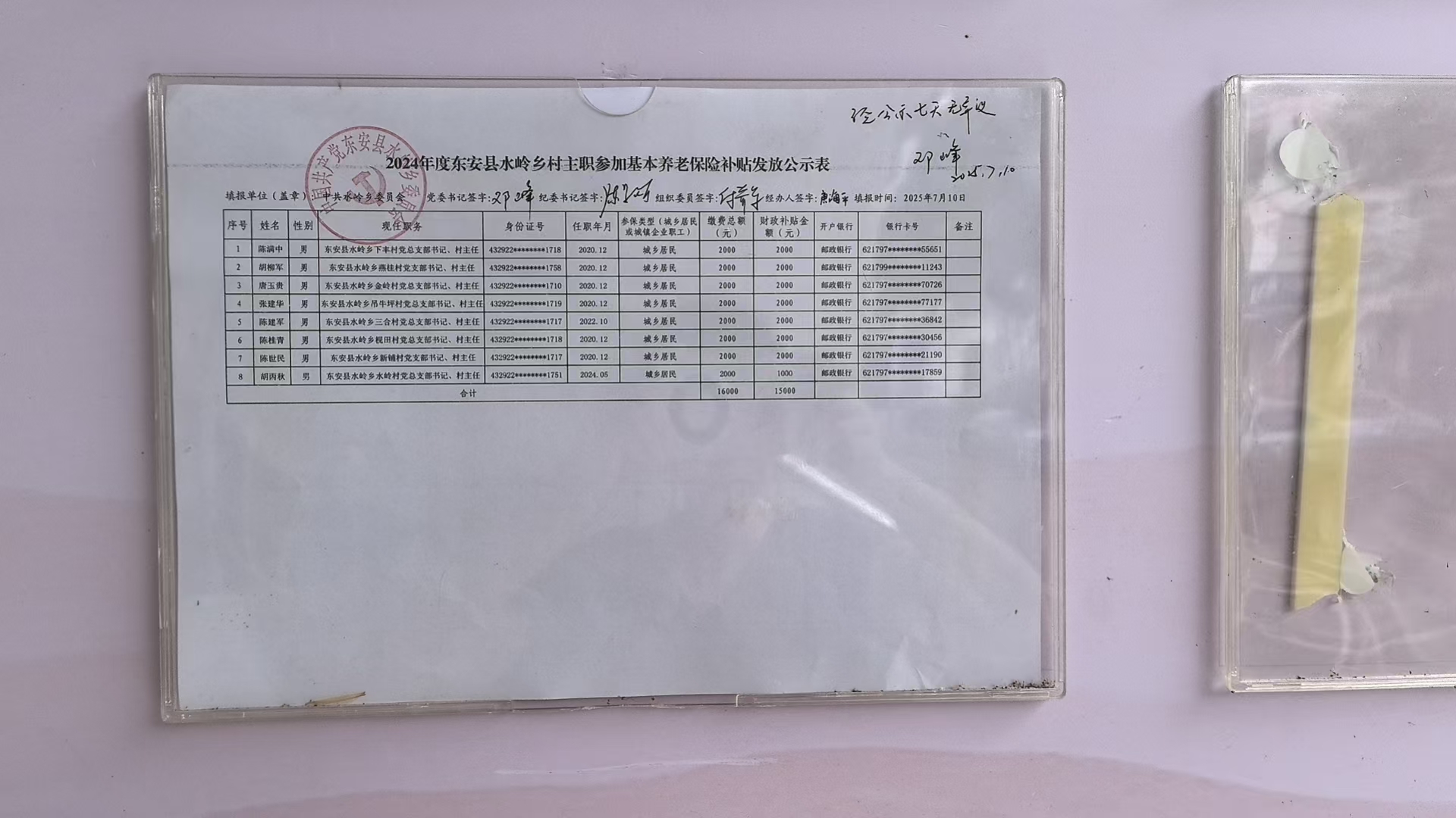 名称: 2024年度东安县水岭乡村主职参加基本养老保险补贴发放公示表