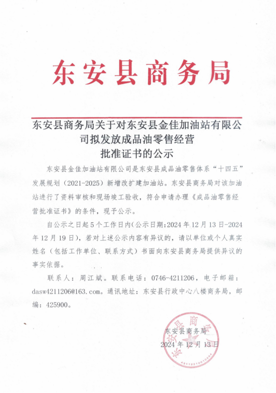 名称: 关于对东安县金佳加油站有限公司拟发放成品油零售经营批准证书的公示