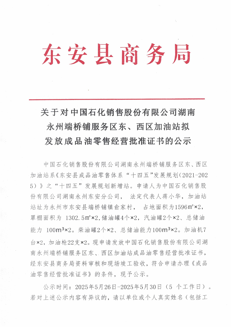 名称: 关于对中国石化销售股份有限公司湖南永州端桥铺服务区东、西区加油站拟发放成品油零售经营批准证书的公示