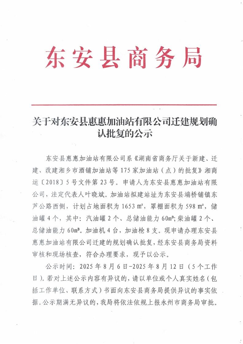 关于对东安县惠惠加油站有限公司迁建规划确认批复的公示