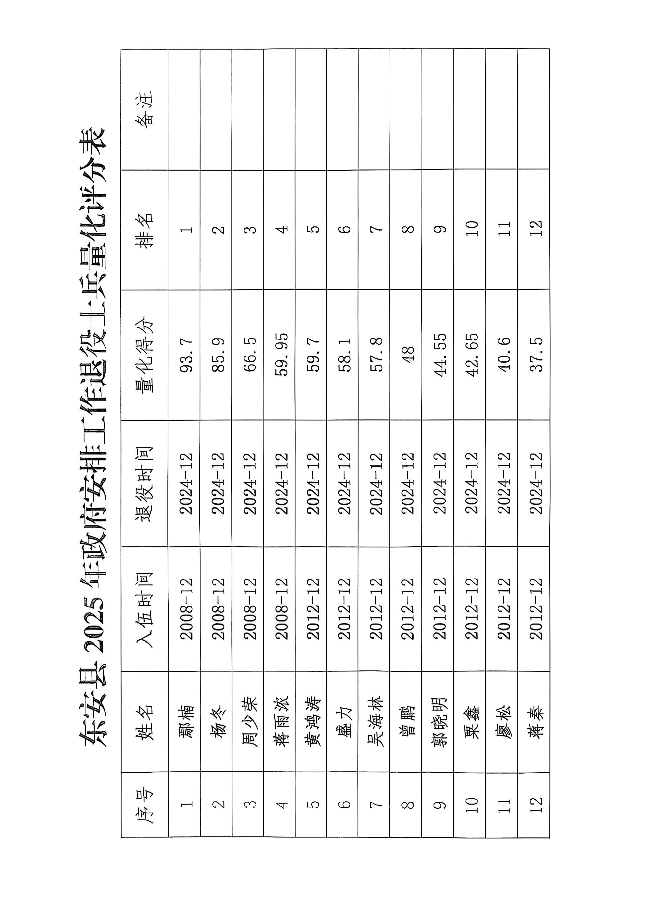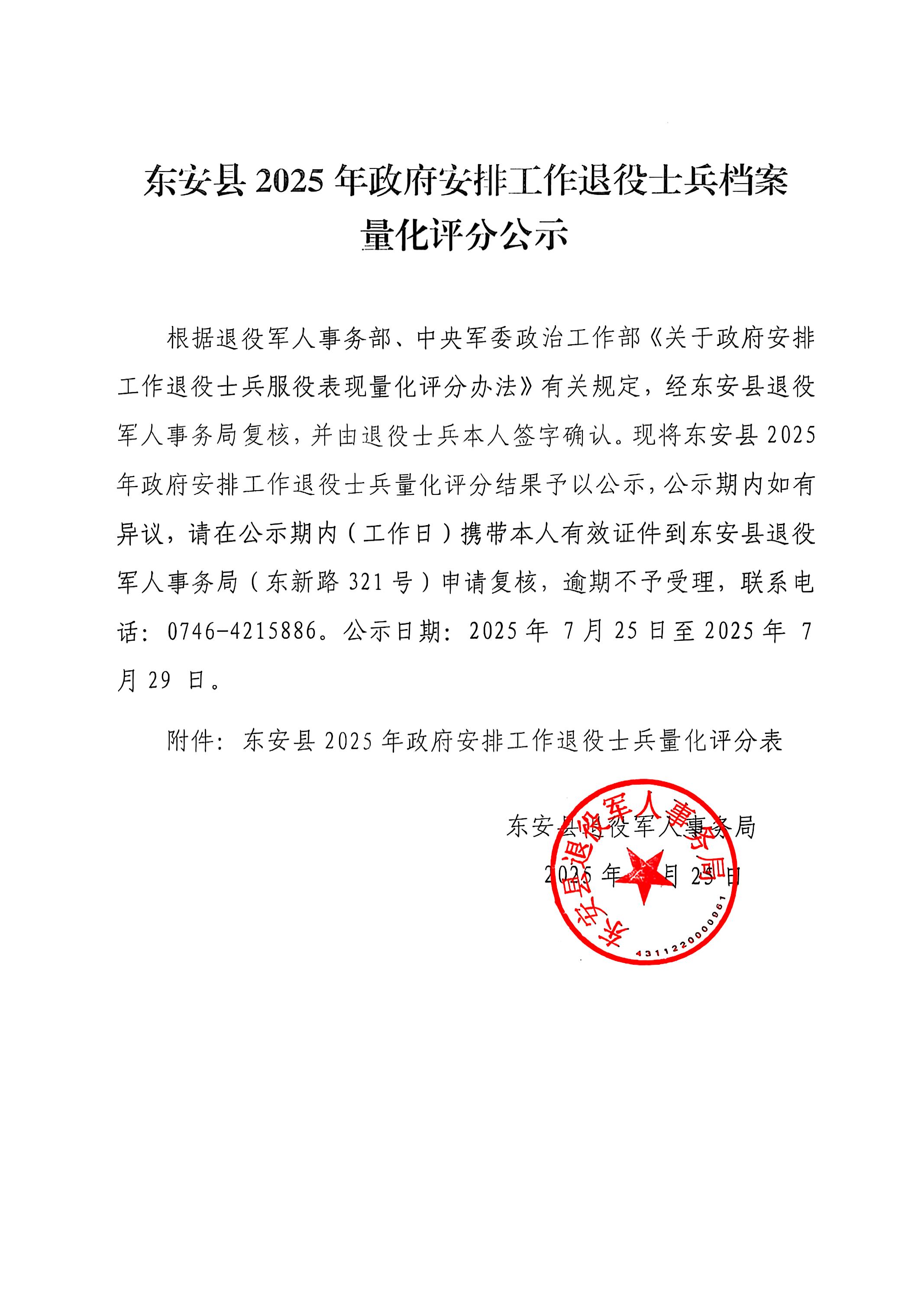 名称: 东安县2025年政府安排工作退役士兵档案量化评分公示