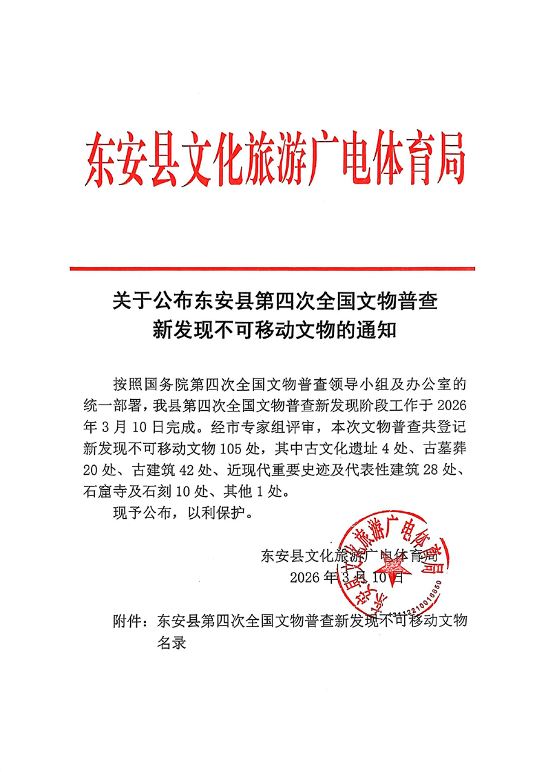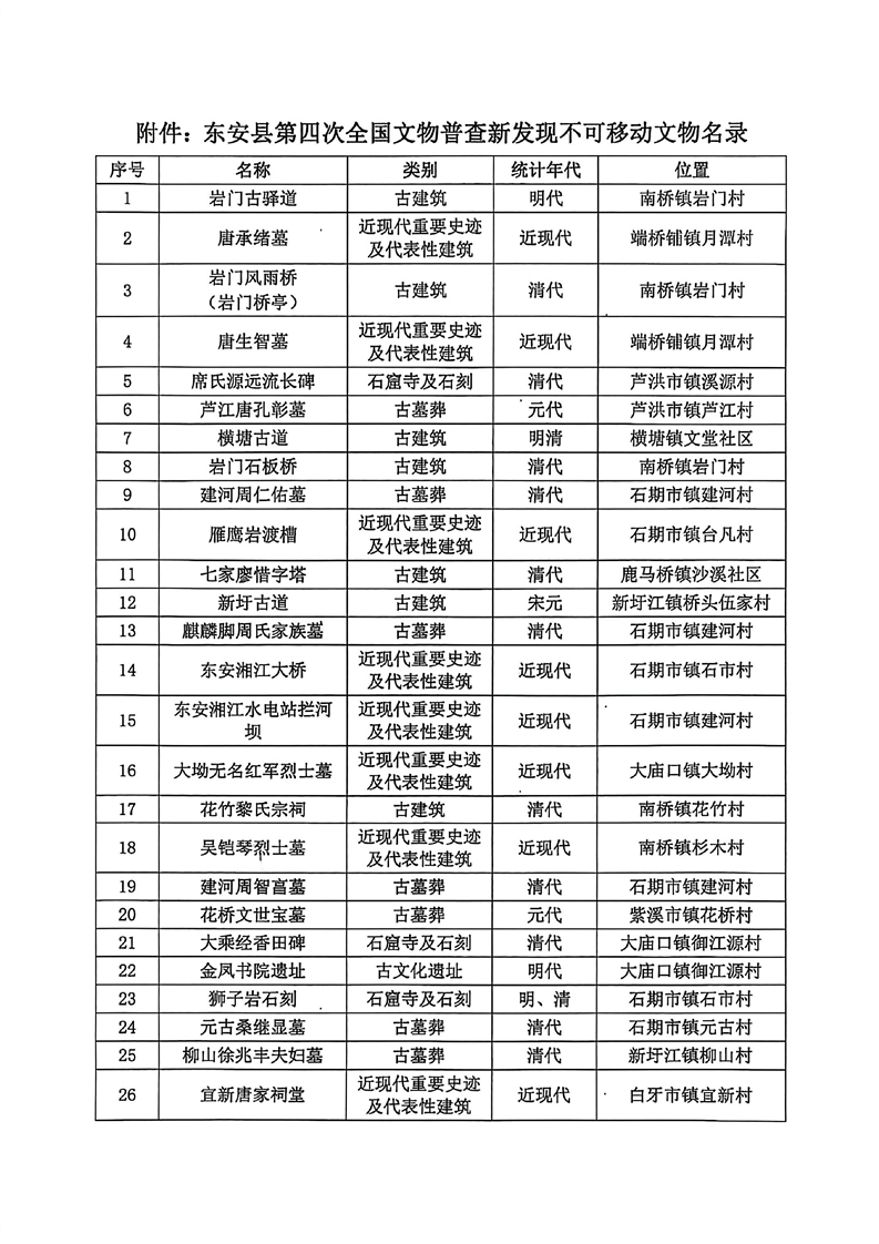 名称: 关于公布东安县第四次全国文物普查新发现不可移动文物的通知