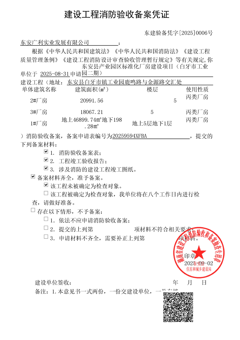 东安县产业园区标准化厂房建设项目(白牙市工业园二期)消防验收备案结果公示