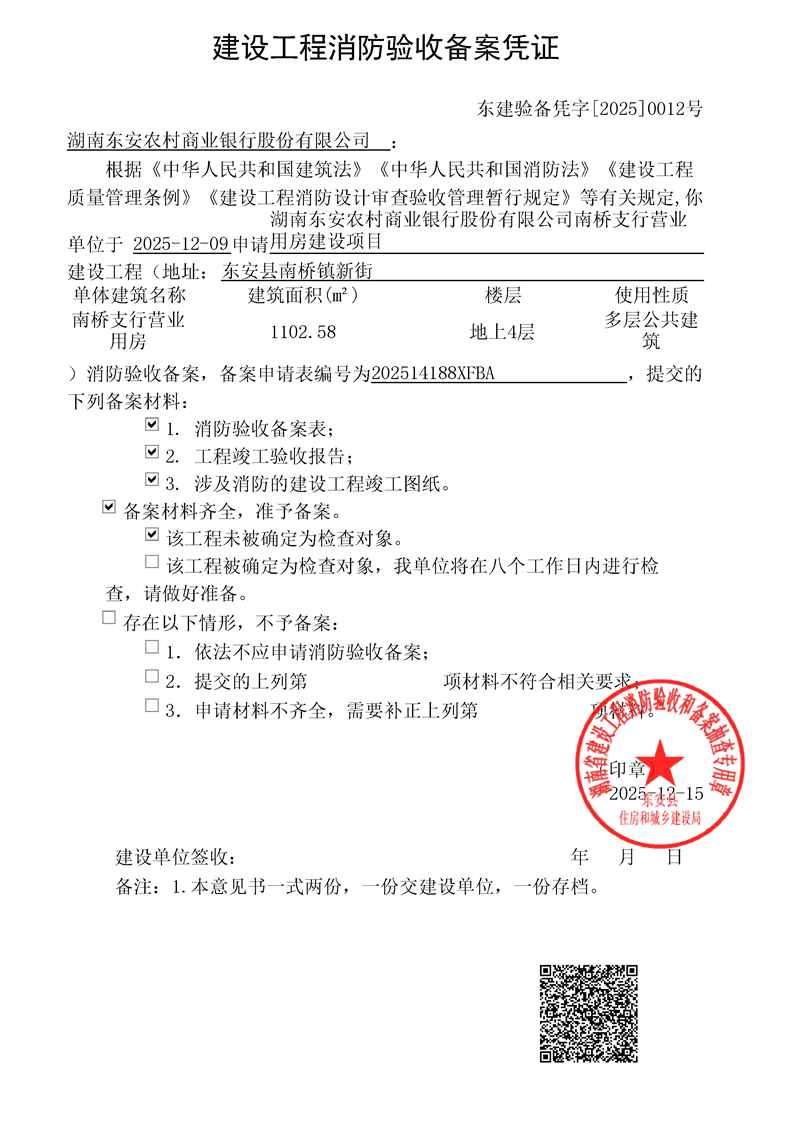 湖南东安农村商业银行股份有限公司南桥支行营业用房建设项目消防验收备案结果公示