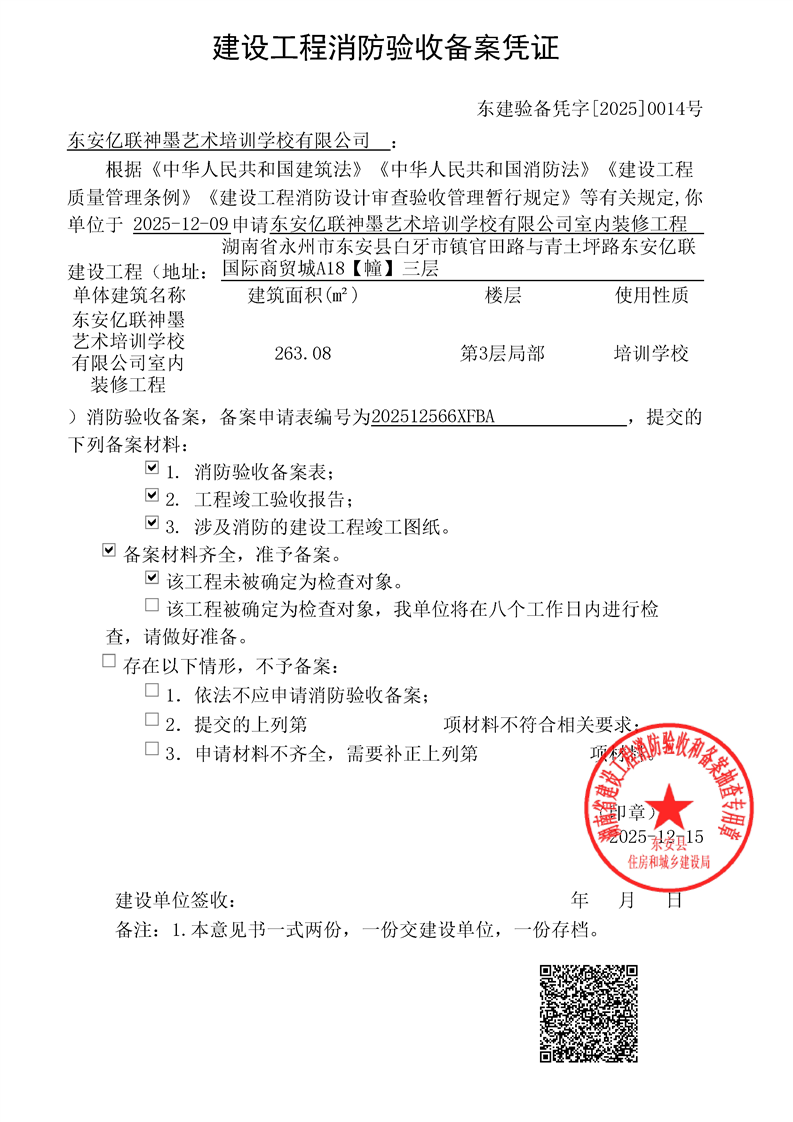 名称: 东安亿联神墨艺术培训学校有限公司室内装修工程消防验收备案结果公示