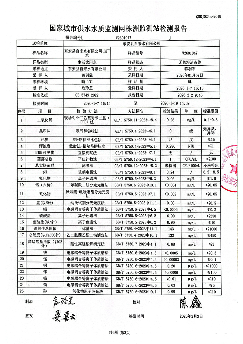 名称: 东安县自来水公司2026年1月水质检测报告