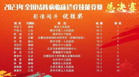 9月15日,第四次全国结核病临床诊疗技能竞赛总决赛在北京举行,道县人民医院何廷飞医生取得影像阅片个人单项第一名和个人全能二等奖,助力湖南省代表队以总分第一名的成绩荣获团体一等奖。