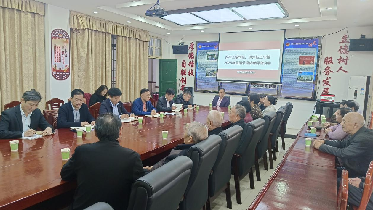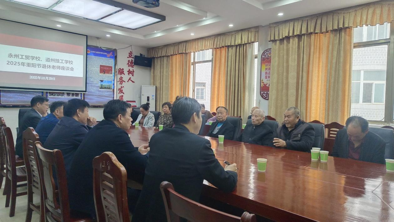 10月29日上午,永州工贸学校举行了2025年重阳节退休教师座谈会。数十位为学校发展奉献了青春与智慧的退休老领导、老教师重返校园,与学校领导班子欢聚一堂,共话往事,共叙情谊,共绘学校发展新蓝图。座谈会由学校党委副书记、校长何月军主持。