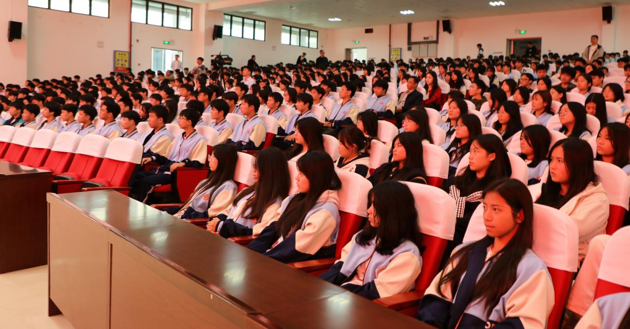 在专题宣讲环节,道县教育局关工委常务副主任唐昆栊以“弘扬爱国主义精神,争做共产主义接班人”为主题,通过讲述袁隆平躬耕田野、钱学森归国报效祖国等感人故事,将爱国情怀娓娓道来。他引导同学们思考“为什么要爱国”“如何爱国”等现实问题,激励大家将爱国情怀融入技能报国的实际行动中。中共道县县委党校原高级讲师曾胜辉的讲述引人入胜。他以校园红色文化墙图片、道县革命遗址实景照片为线索,配合生动语言,将道县红色历史娓娓道来。当大屏幕出现熟悉的校园“红色印记”,当家乡山水被赋予英雄故事,历史的距离瞬间拉近。师生们仿佛重回烽火岁月,陈树湘等革命先烈的铮铮铁骨触手可及。现场互动热烈、掌声如潮。这场沉浸式宣讲让红色记忆鲜活起来,极大激发了学子们爱国爱家、矢志报国的豪情与壮志。