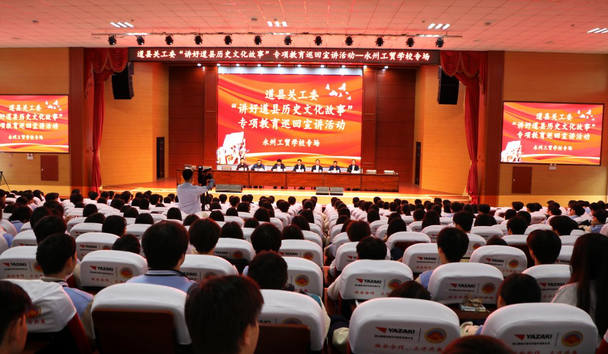 为传承红色基因,赓续红色血脉,10月29日,道县关工委“讲好道县历史文化故事”专项教育巡回宣讲活动走进永州工贸学校。活动现场座无虚席,气氛庄重而热烈。中共道县县委常委、组织部部长、县关工委主任陈葳等领导专家出席活动,宣讲活动由学校党委书记尹存成主持,逾千名师生代表共同聆听了这场浸润人心的文化盛宴。