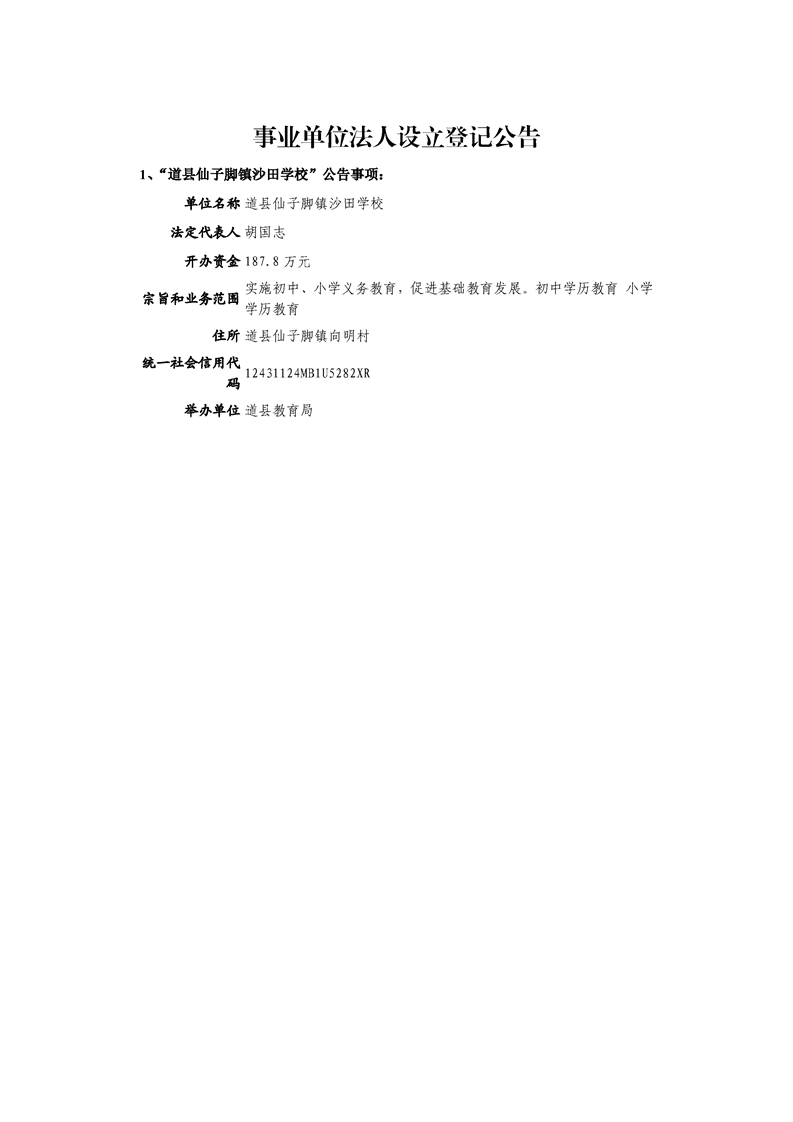 2025年道县事业单位法人设立登记公告(设立公告第202501期)