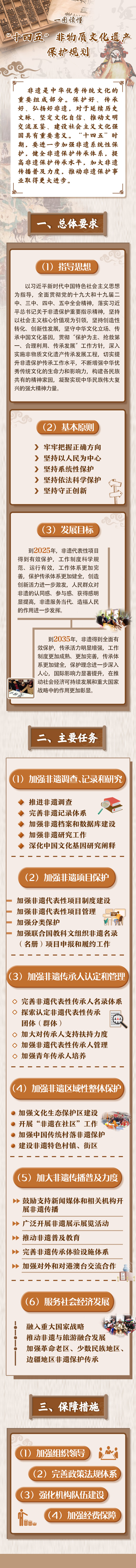 《规划》从加强组织领导、完善政策法规体系、强化机构队伍建设、加强经费保障4个方面保障各项措施的落实,推动形成有利于非遗保护传承的体制机制和社会环境。