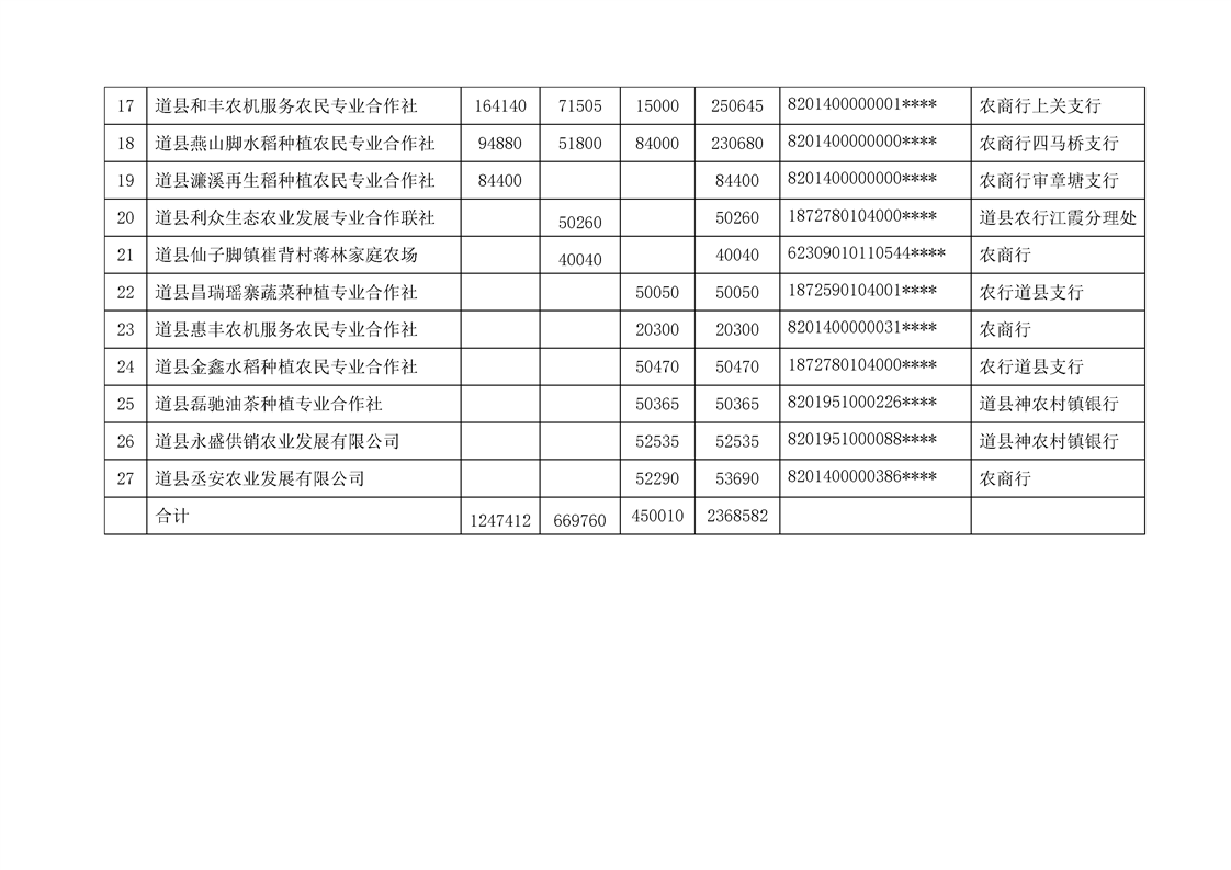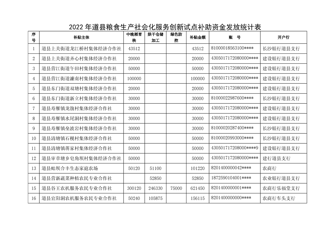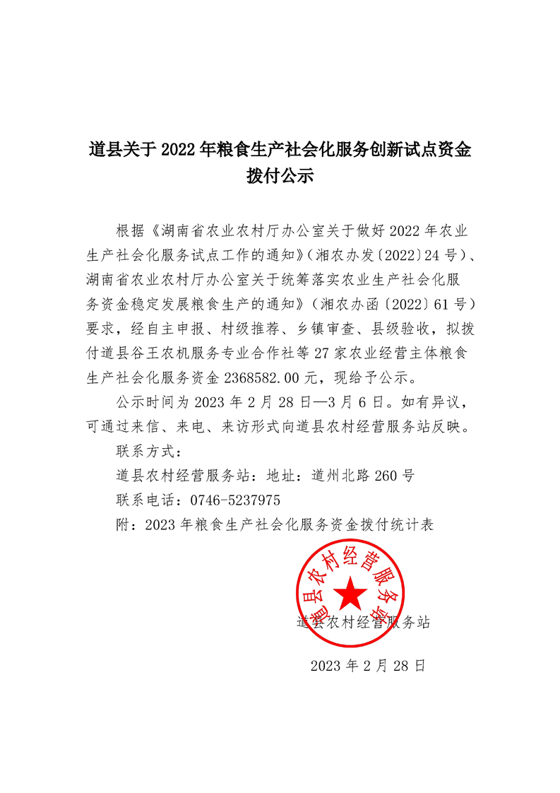 道县关于2022年粮食生产社会化服务创新试点资金拨付公示