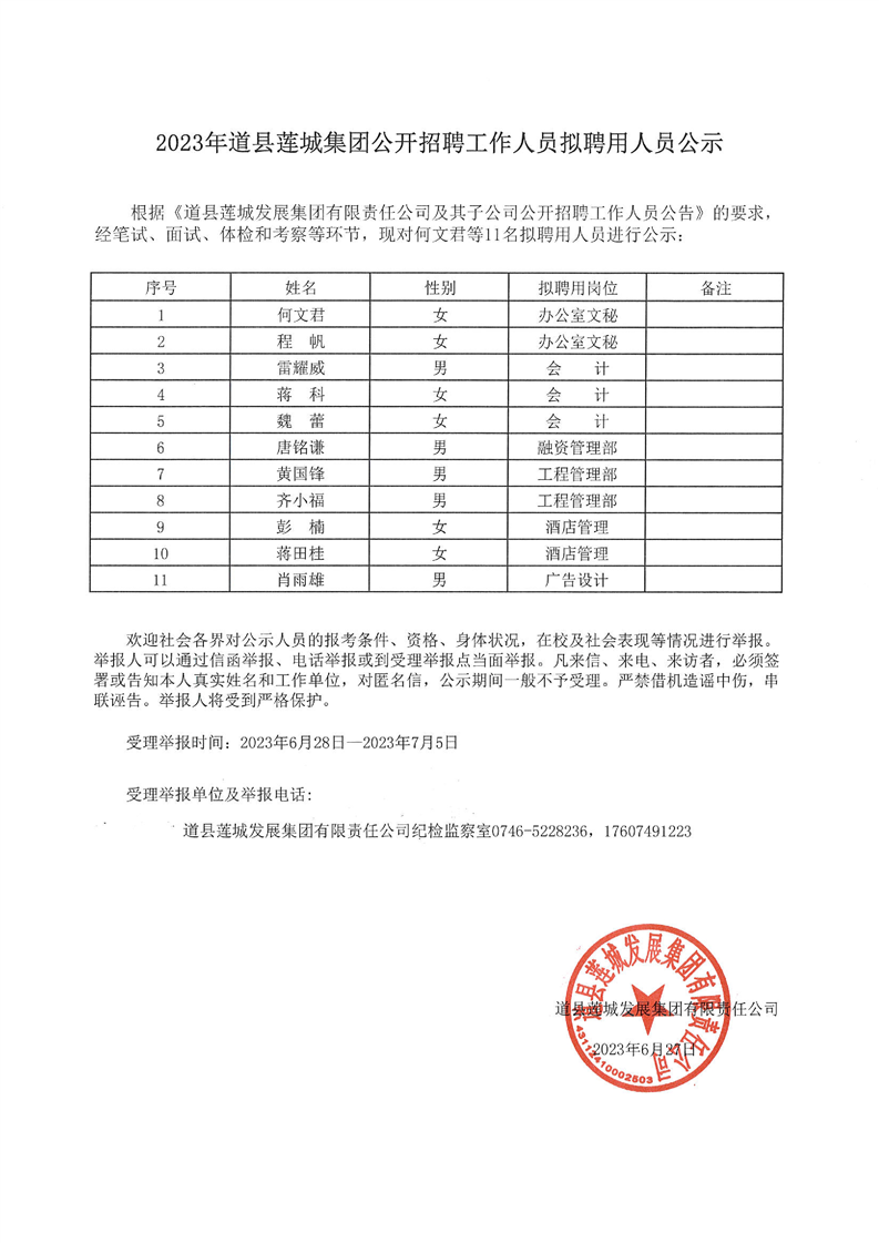 2023年道县莲城集团公开招聘工作人员拟聘用人员公示