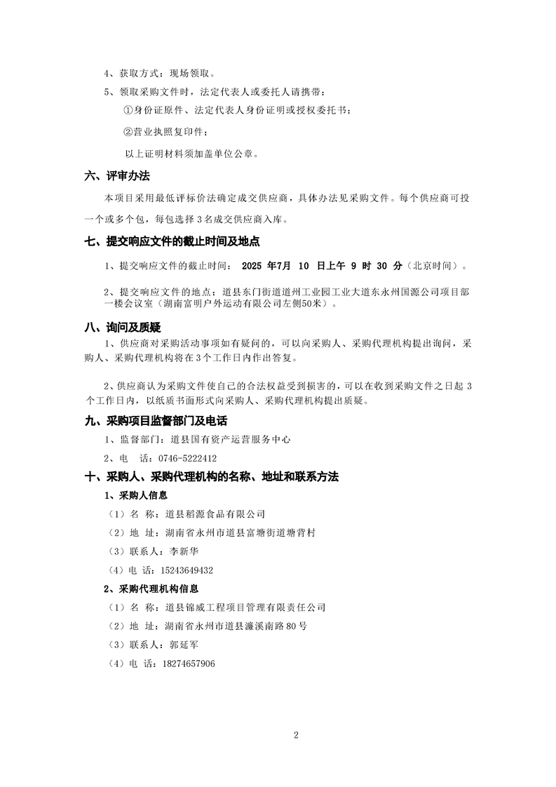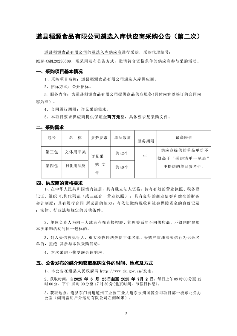 道县稻源食品有限公司遴选入库供应商采购公告(第二次)