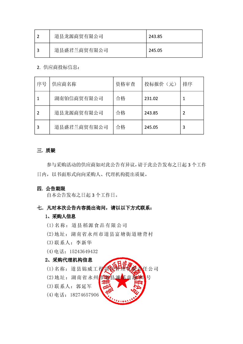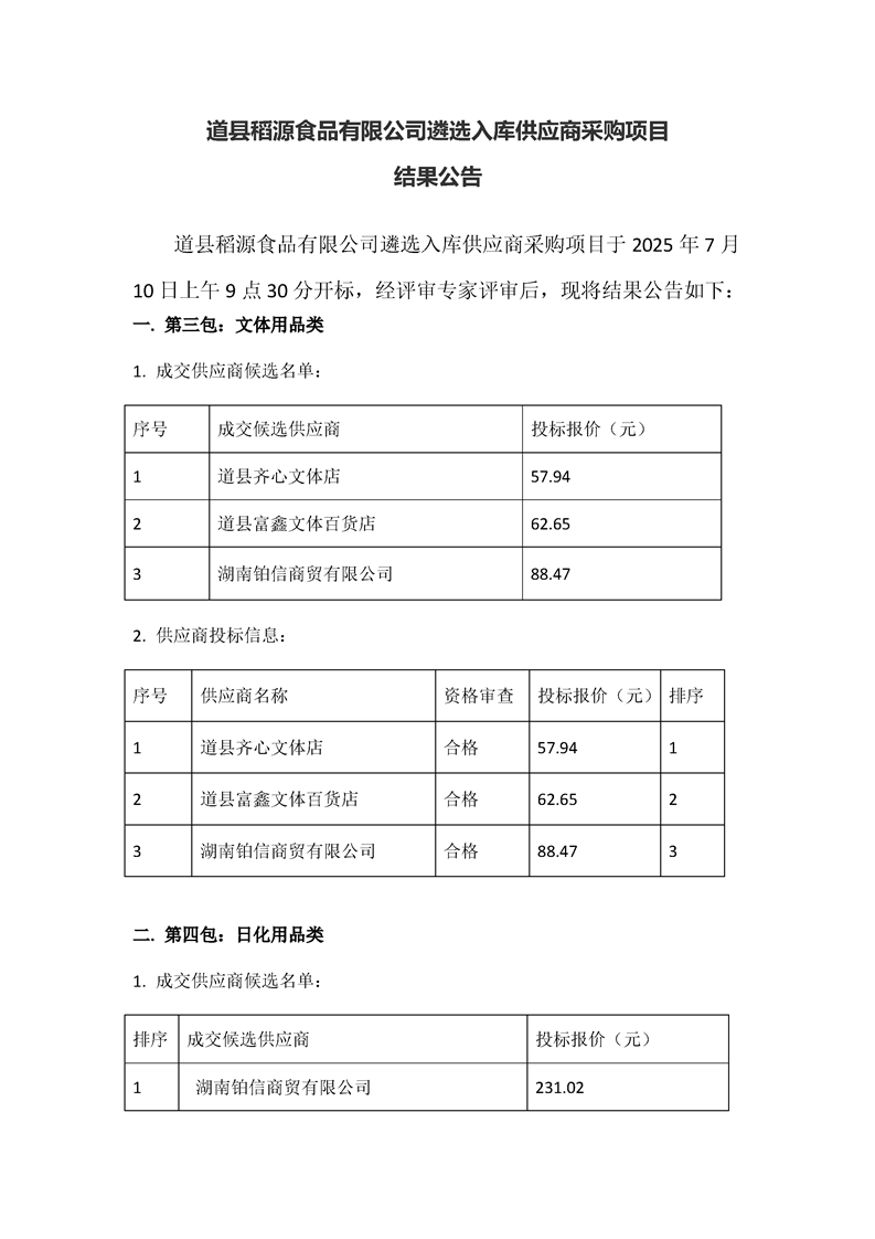 道县稻源食品有限公司遴选入库供应商采购项目结果公告