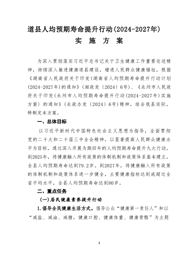 道县卫健局关于对《道县人均预期寿命提升行动(2024-2027年)实施方案》的政策解读