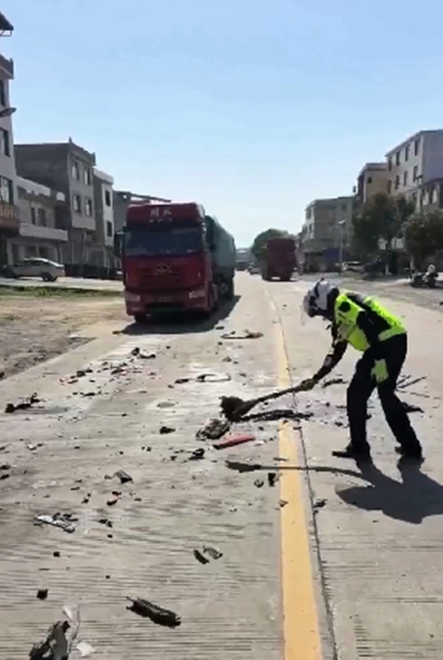 当日15时许,该大队执勤交警巡逻至357国道道县上关街道坪塘路段时,发现一处路面散落了许多杂物,影响车辆通行,存在安全隐患。见状,交警立即上前处置。交警一边指挥过往车辆避让,一边从附近村民家中借来扫帚,用力清扫杂物,将路面清扫干净,使道路迅速恢复安全畅通。