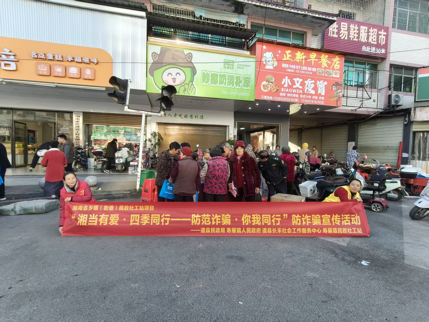 为提高老年人防范诈骗的意识和能力,切实维护老年群体财产安全,近日,在道县民政局的指导下,道县长禾社会工作服务中心携手寿雁镇民政社工站在寿雁镇集市开展了“湘当有爱·四季同行——防范诈骗·你我同行”主题宣传活动。