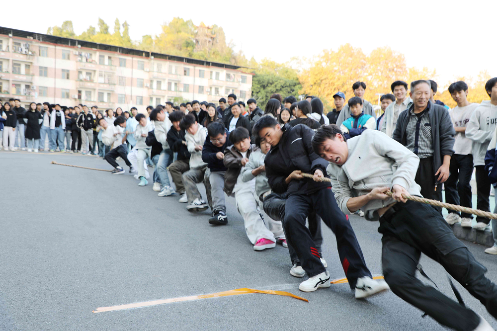 赛场上,队员个个精神抖擞,摩拳擦掌。随着裁判一声哨响,比赛正式拉开序幕。拔河比赛中队员们紧握长绳,重心下压,齐声呼号。每一次拉锯都牵动着在场所有人的心,随着绳子中线来回移动,周围观赛师生的加油声,欢呼声此起彼伏,比赛的热烈氛围一浪高过一浪!气排球比赛中,队员们聚精会神,紧盯皮球运动,配合默契,时而俯身接挡,时而起跳扣球,随着球员的每一次精彩表现,比赛气氛都被带到了高潮!