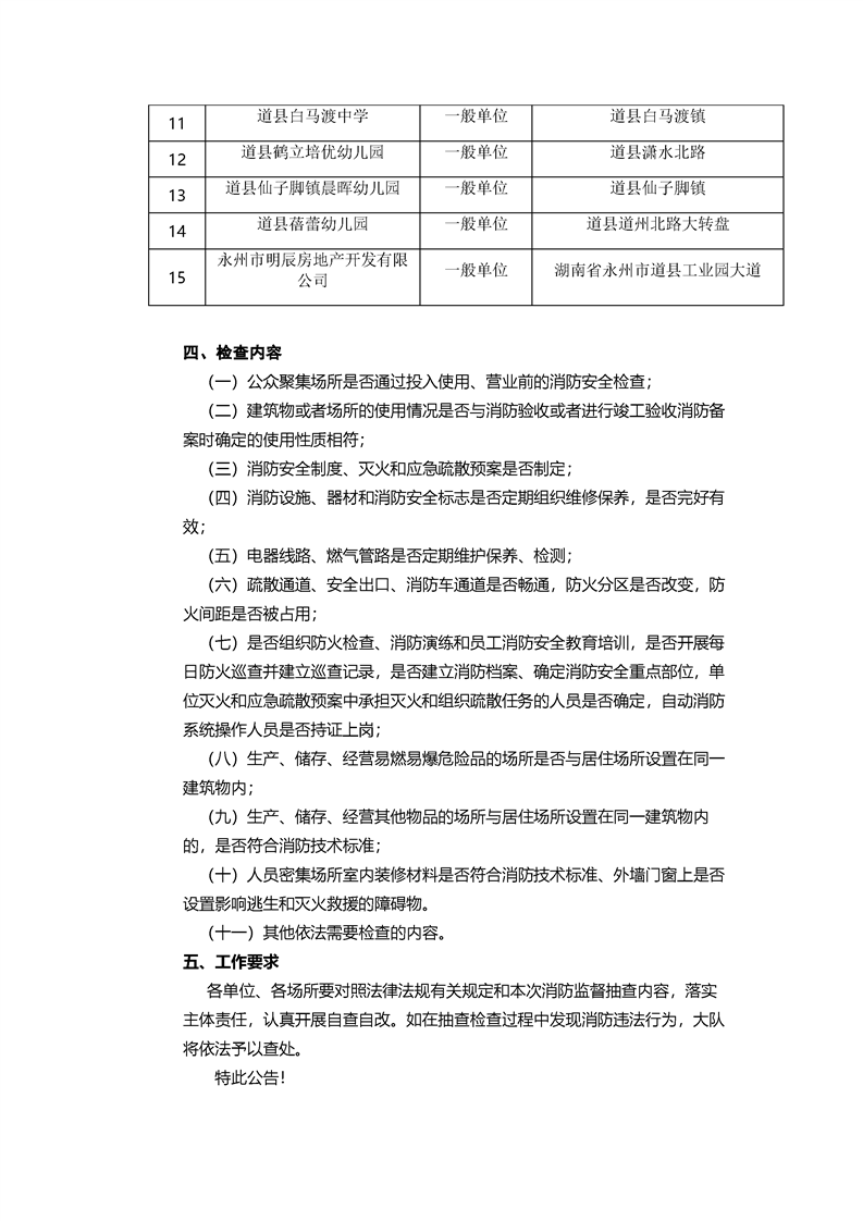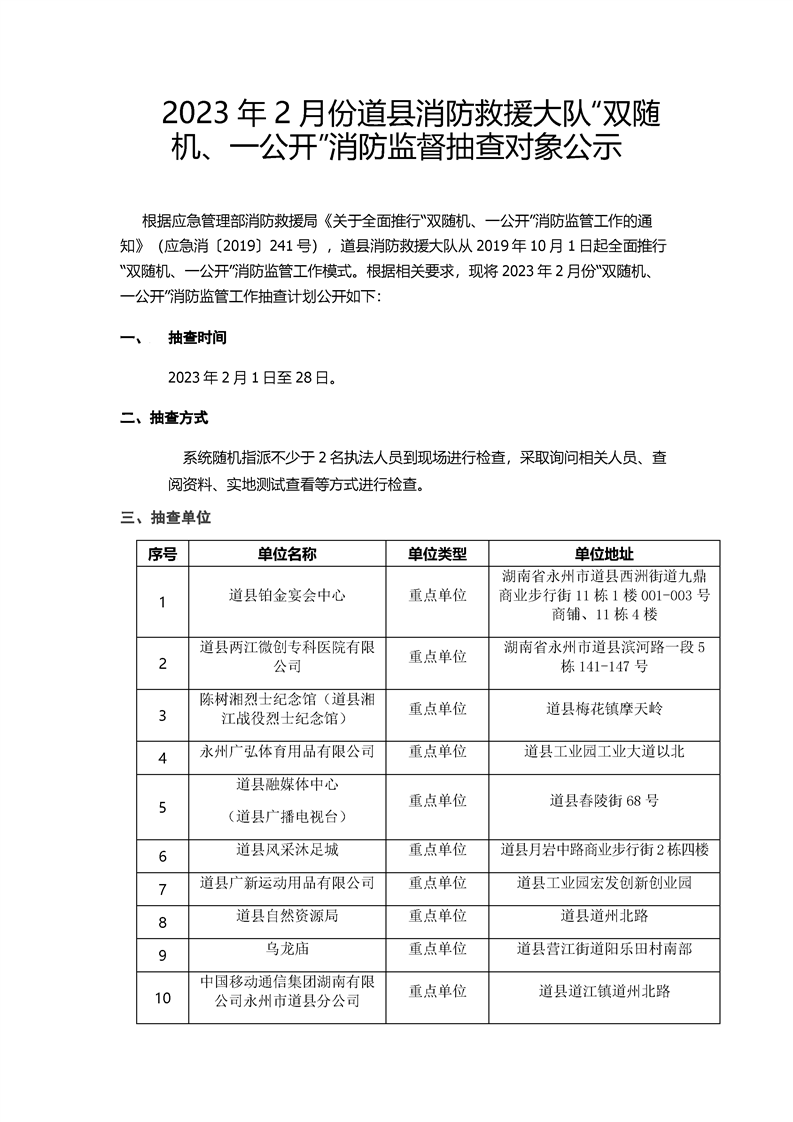 2023年2月份道县消防救援大队“双随机、一公开”消防监督抽查对象公示