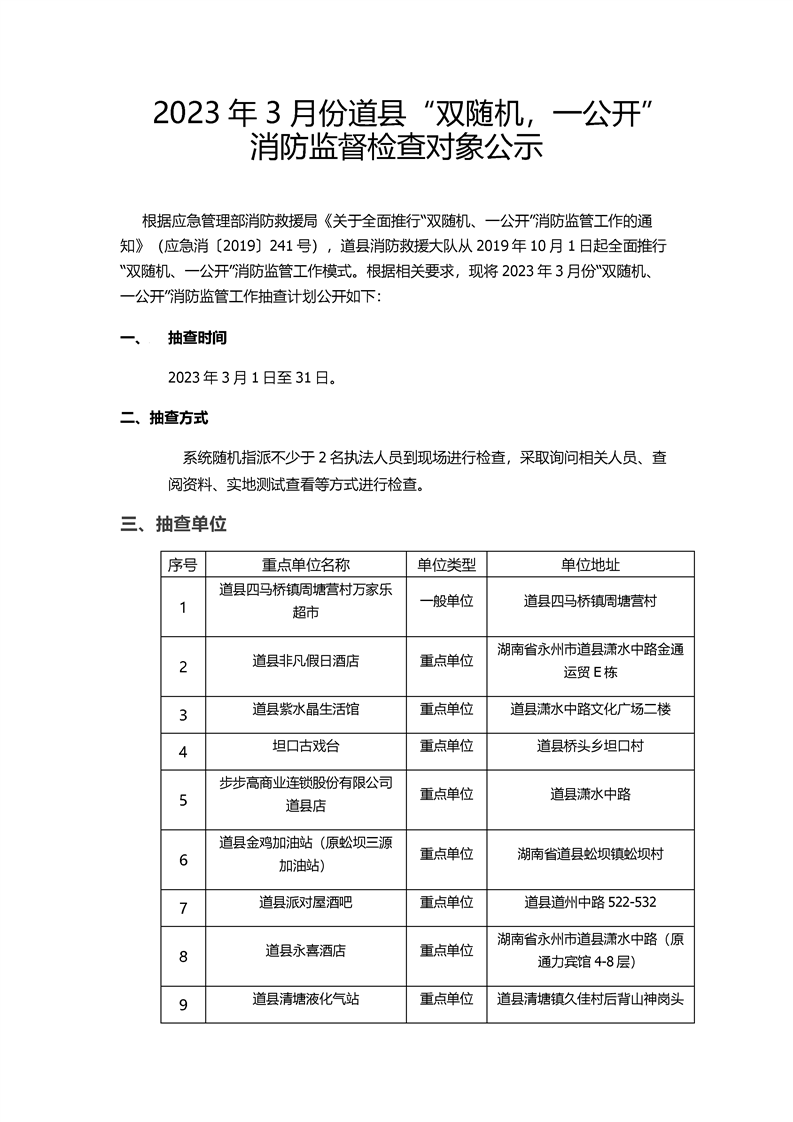 2023年3月份道县“双随机、一公开”消防监督检查对象公示