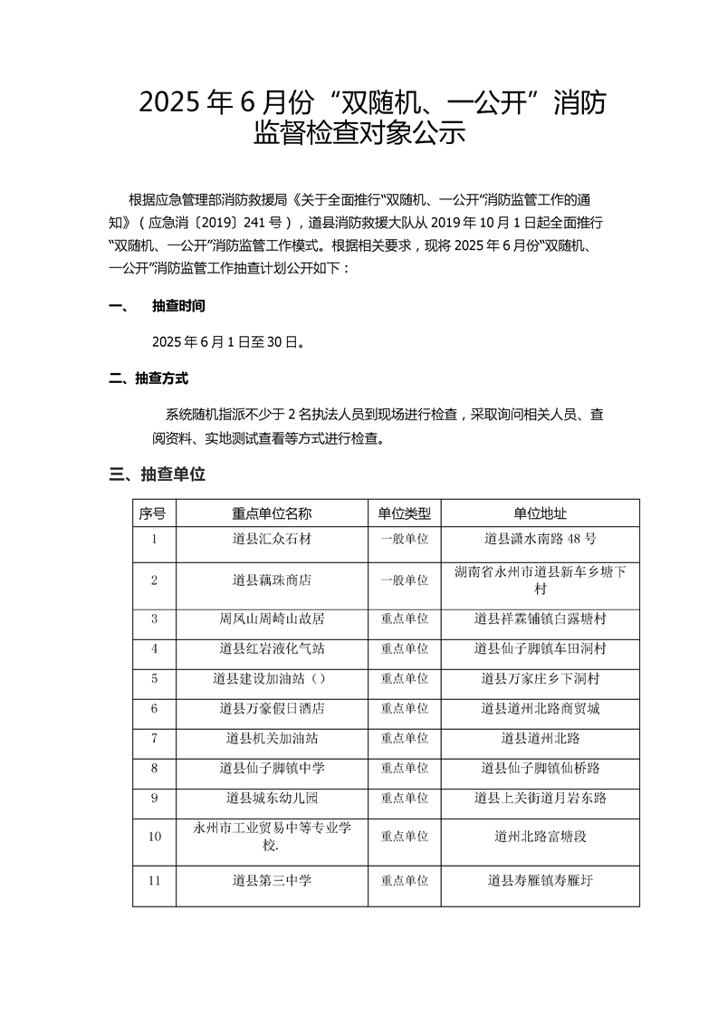 2025年6月份“双随机、一公开”消防监督检查对象公示