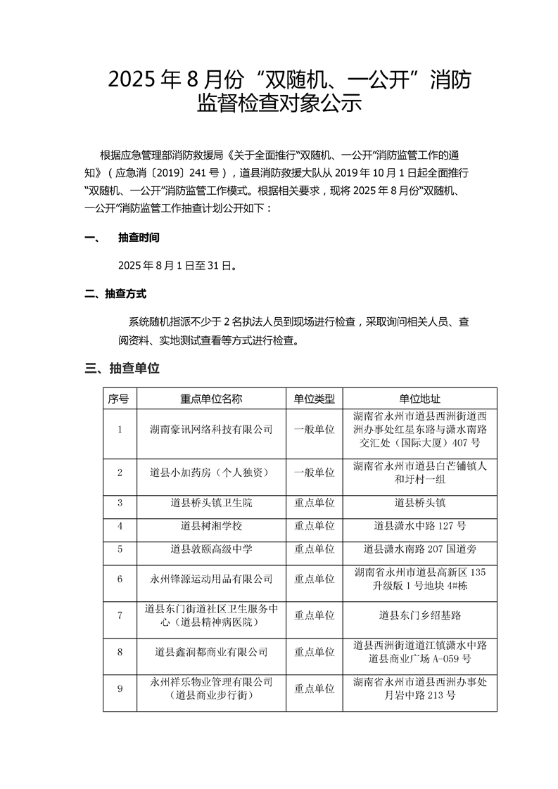 2025年8月份“双随机、一公开”消防监督检查对象公示