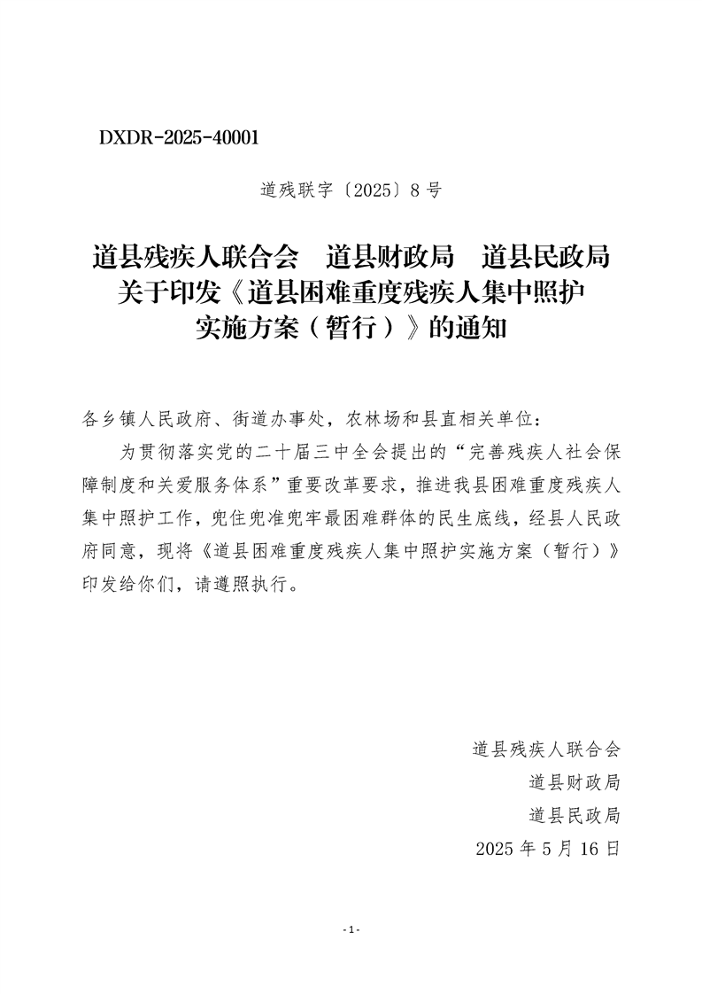 关于印发《道县困难重度残疾人集中照护实施方案(暂行)》的通知