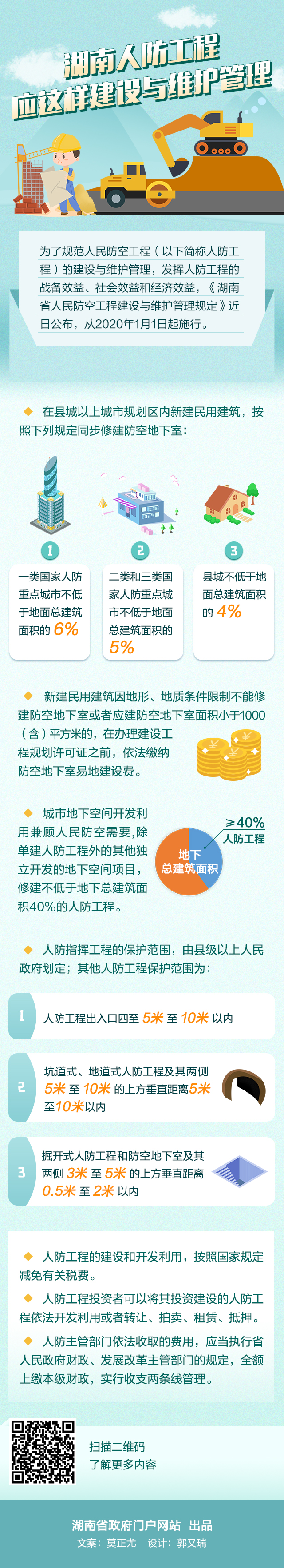 为了规范人民防空工程的建设与维护管理,发挥人防工程的战备效益、社会效益和经济效益,《湖南省人民防空工程建设与维护管理规定》近日公布,从2020年1月1日起施行。