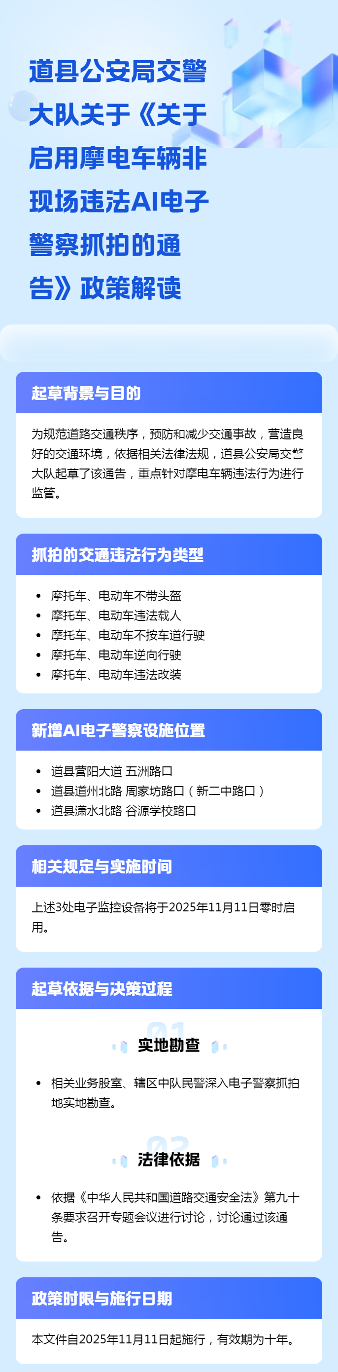 道县公安局交警大队关于《关于启用摩电车辆非现场违法AI电子警察抓拍的通告》的政策解读