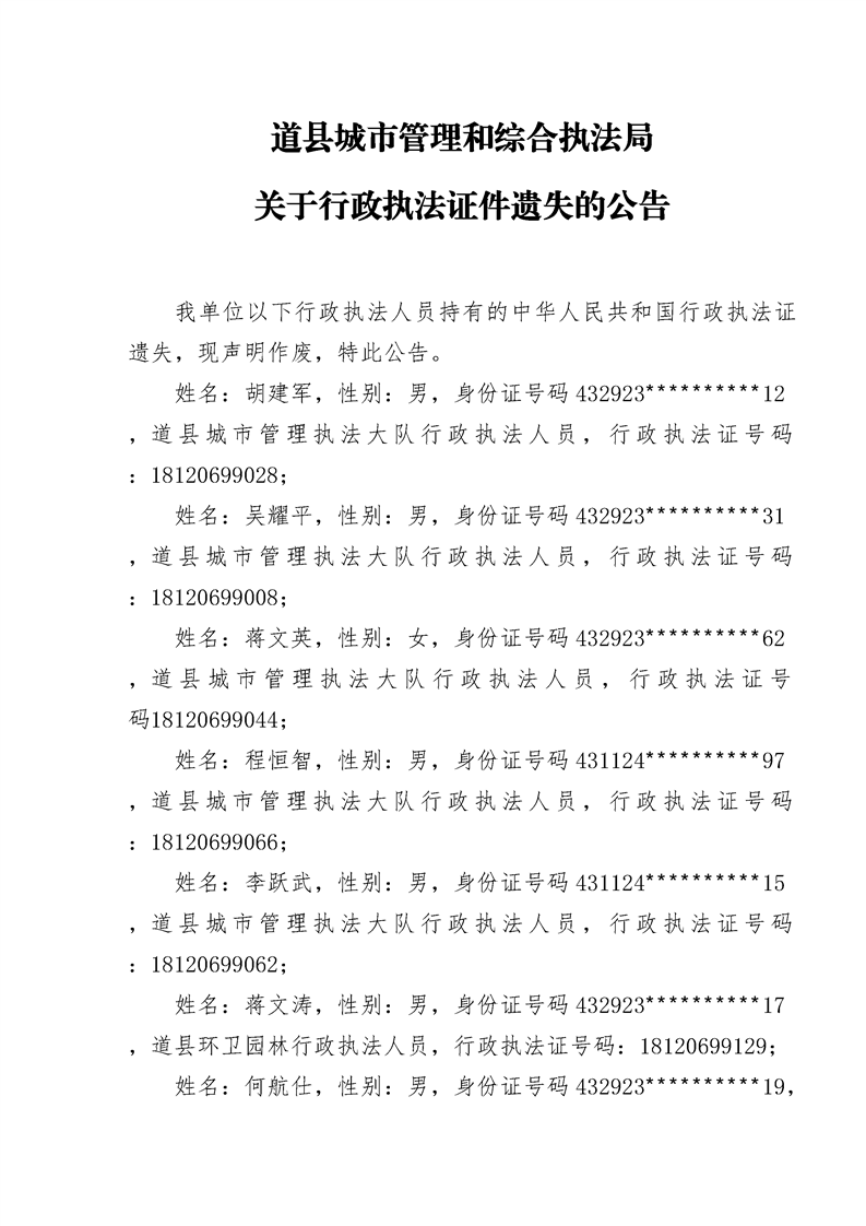 关于行政执法证件遗失的公告
