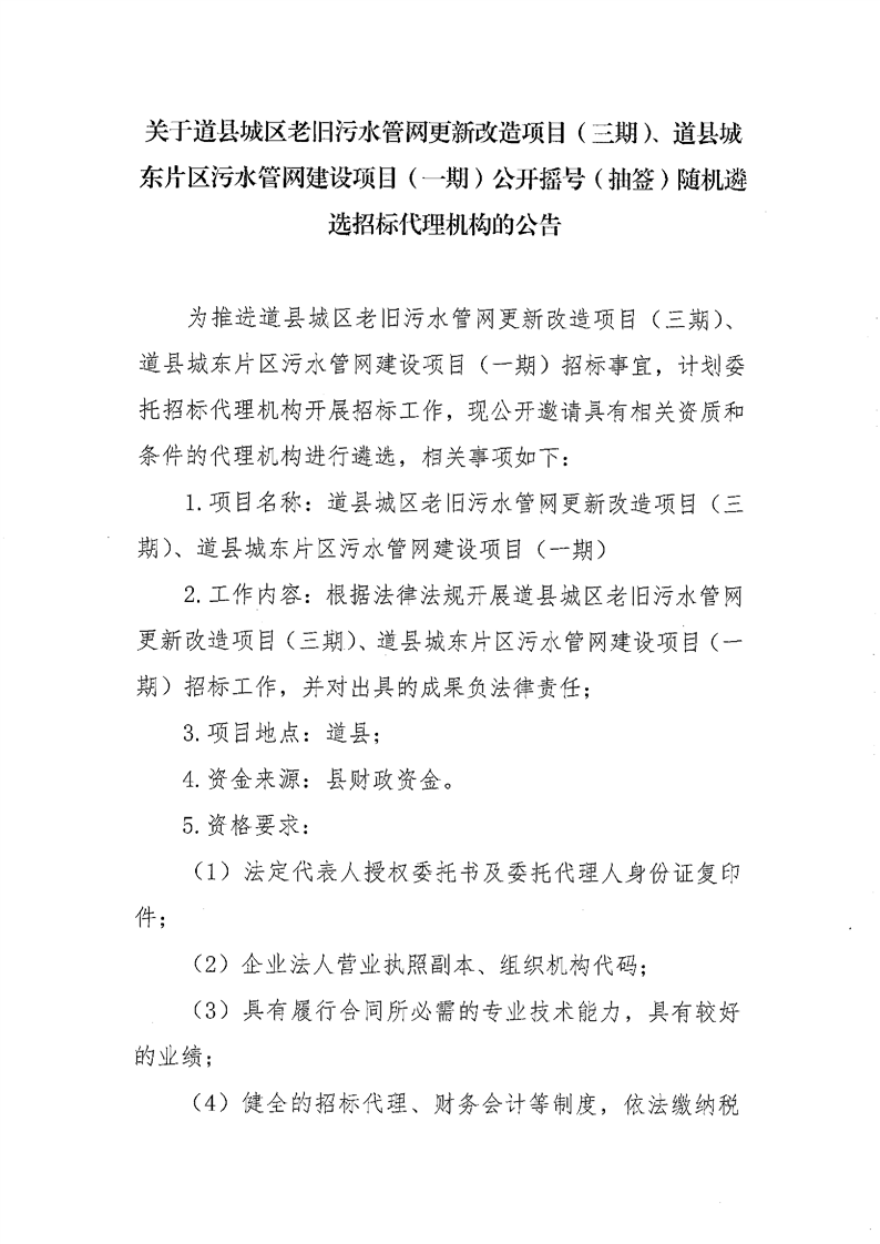 关于道县城区老旧污水管网更新改造项目(三期)、道县城东片区污水管网建设项目(一期)公开摇号(抽签)随机遴选招标代理机构的公告