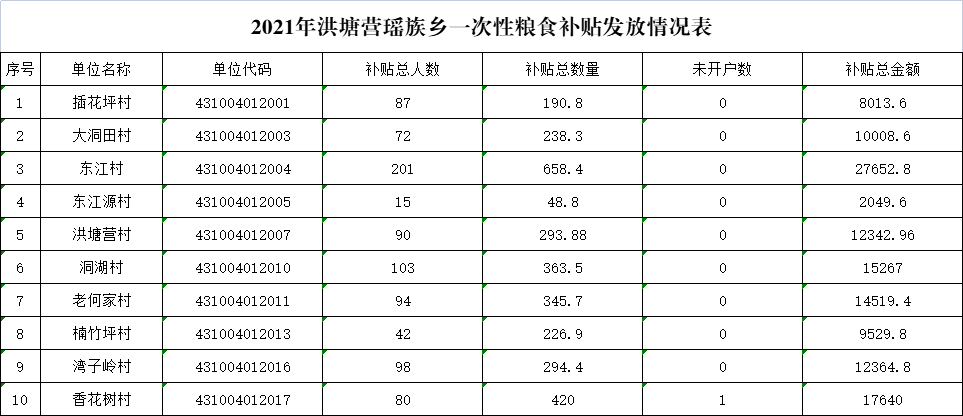2021年洪塘营瑶族乡一次性粮食补贴发放情况表