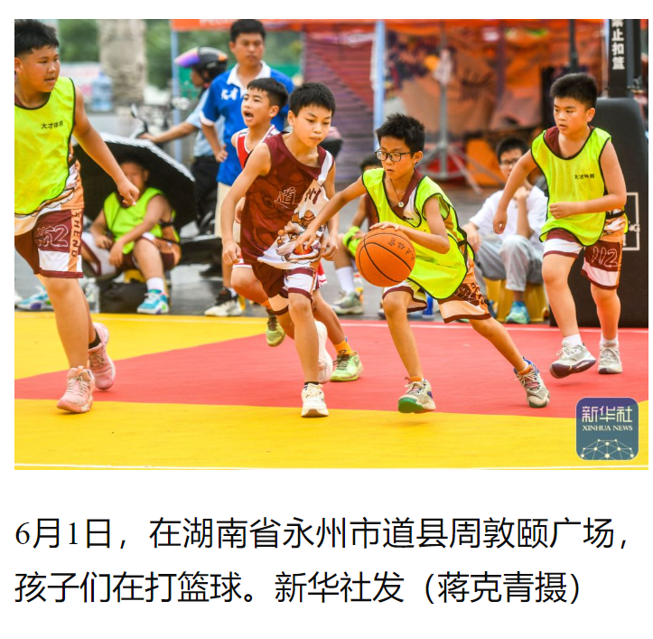 6月1日,在湖南省永州市道县周敦颐广场,孩子们在打篮球。