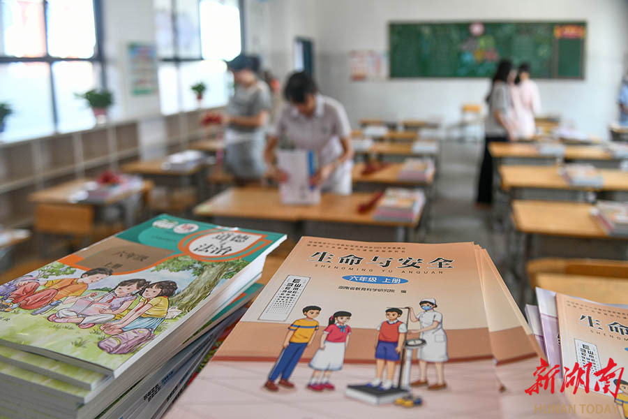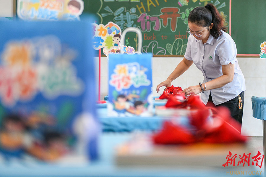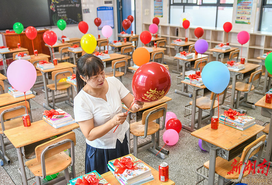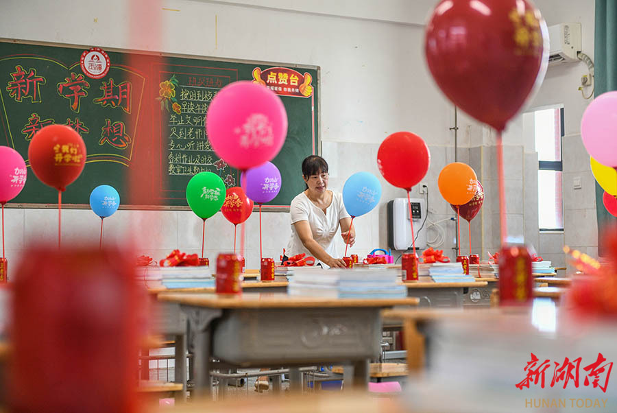 8月29日,道县道州玉潭(东阳)学校,老师在精心布置教室。新学期开学在即,道县各地学校加紧开展教室布置、卫生清理、安全检查、书本发放等准备工作,迎接新学期。蒋克青 蒋凭姣 摄影报道(湖南图片库)