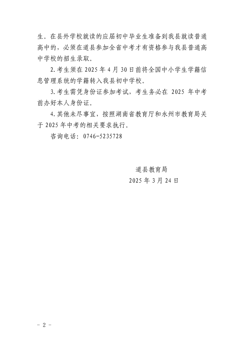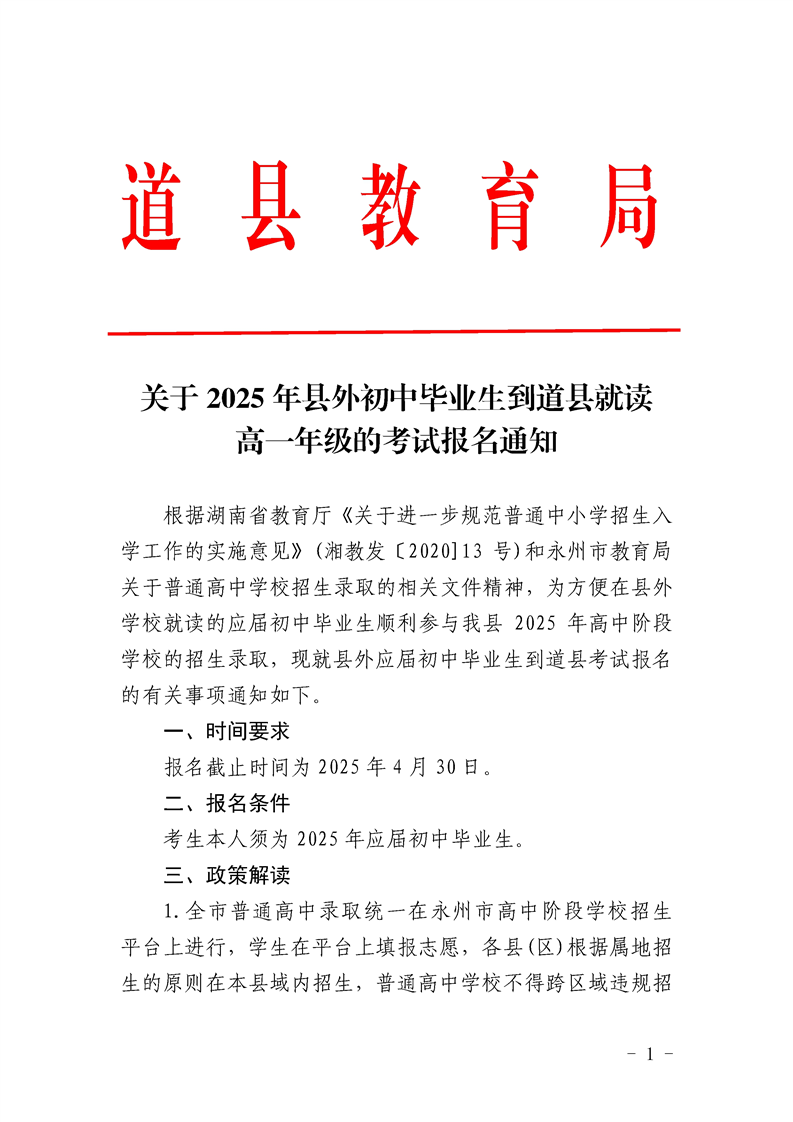关于2025年县外初中毕业生到道县就读高一年级的考试报名通知