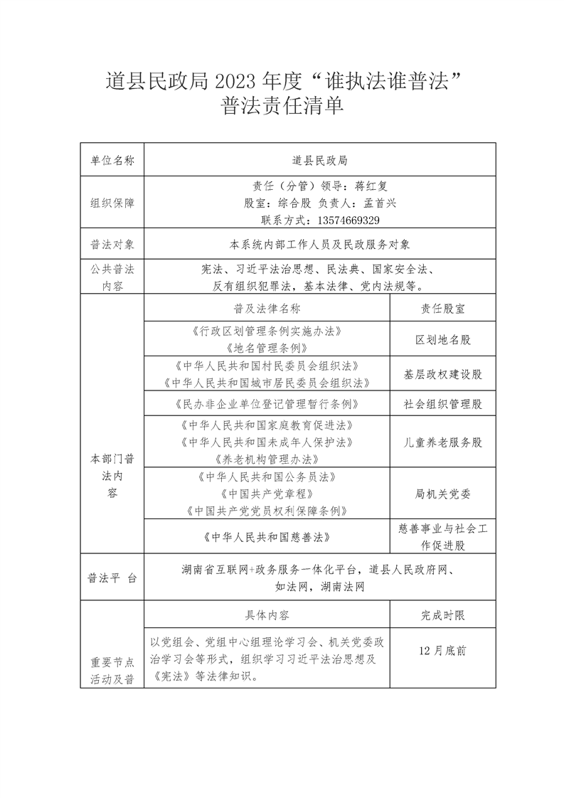 道县民政局2023年度“谁执法谁普法”普法责任清单