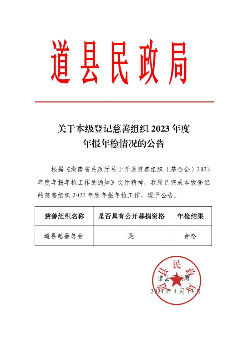 关于本级登记慈善组织2023年度年报年检情况的公告