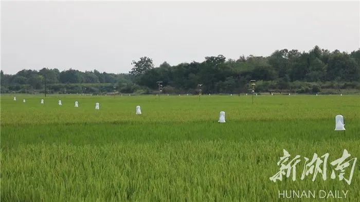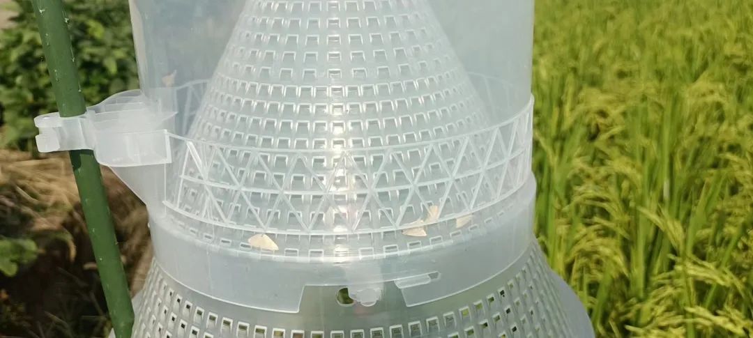 这些白色笼子是今年最新引进的水稻螟虫诱捕器,诱捕器里装有能散发性激素的诱剂,通过它来诱捕雄性水稻螟虫,雄虫出不来,外面的雌虫便无法繁殖,从源头上减少了虫害的发生。