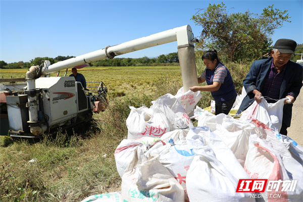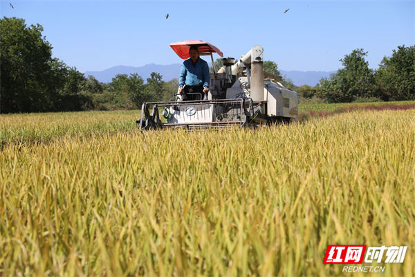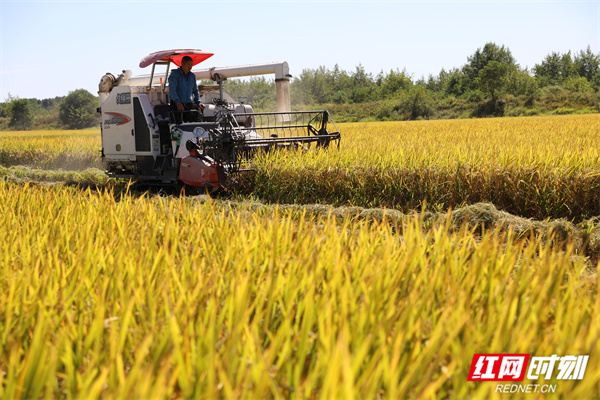 金秋时节,湖南省永州市道县乡村的稻晚陆续成熟,大地金黄遍野,农民抓住晴好天气抢收稻谷,呈现丰收的美丽画卷。道县是粮食生产大县,今年粮食种植面积达到88万亩。