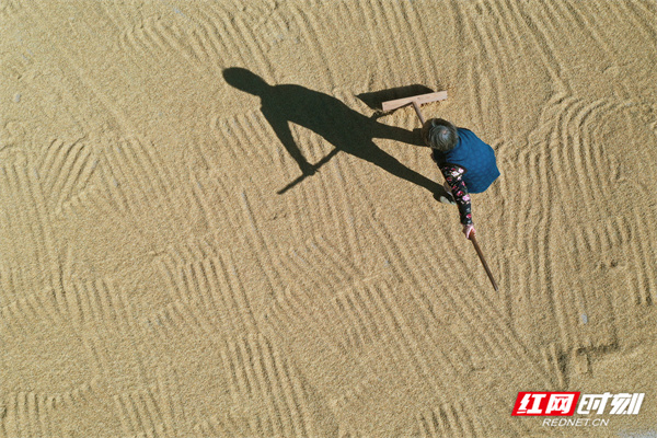 2022年10月10日,在湖南省永州市道县白马渡镇樟武坊村,村民在晾晒稻谷。