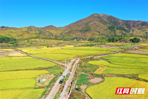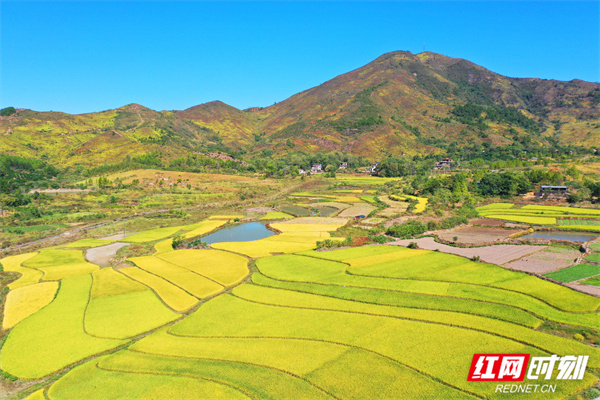 2022年10月10日,在湖南省永州市道县白马渡镇樟武坊村,金色的稻田美如画卷。