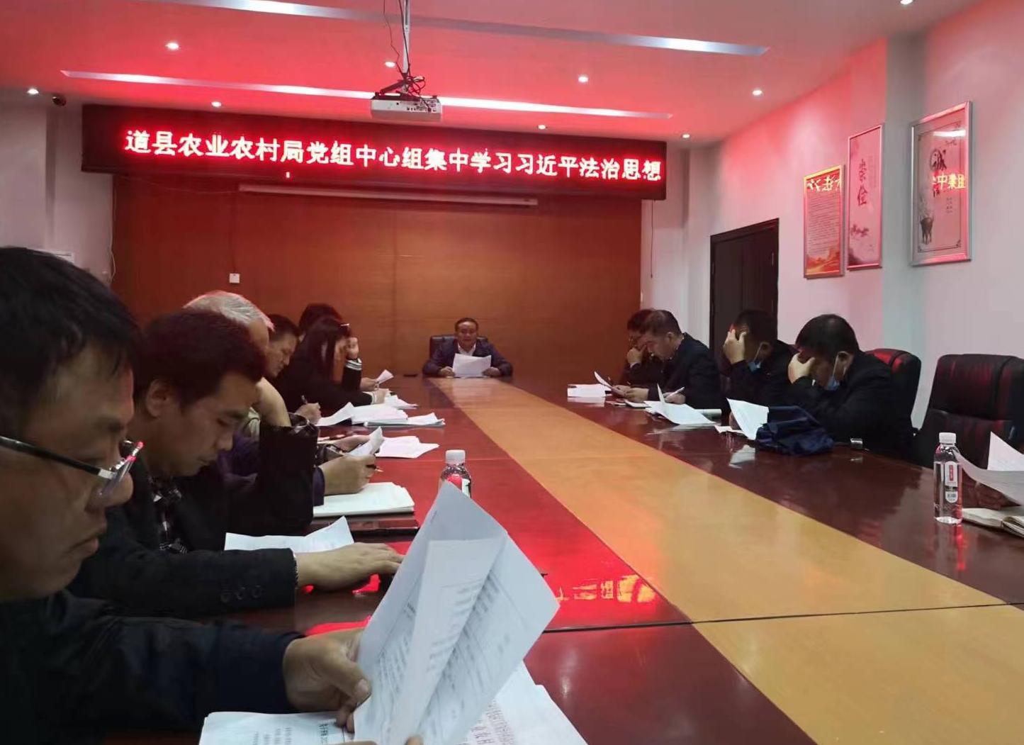 近日,道县农业农村局召开局党组中心组集体学习会,深入学习领会习近平法治思想《论坚持全面依法治国》《习近平法治思想学习纲要》,不断提高农业综合服务法治化水平,会议由局党组书记、局长陈旺胜主持。