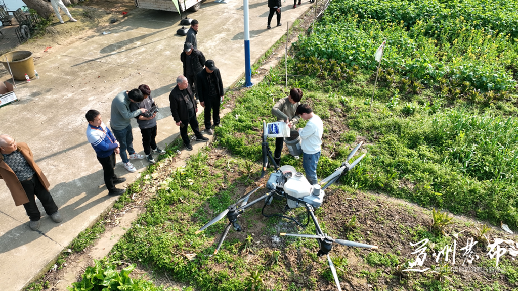 在道县祥霖铺镇两河口村飞防现场,永州市农科所及道县农业农村局的技术员一边组织种植大户观摩,一边指导农户调配飞防所用的硼肥、杀菌剂、杀虫剂等混配液剂量。