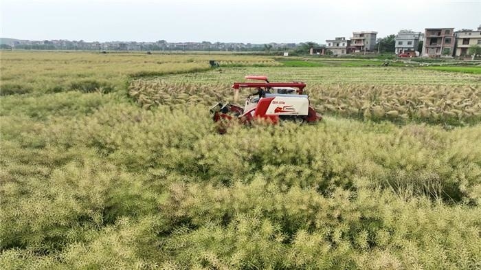 在道县蚣坝镇光家岭村万亩“稻-稻-油”三熟制水旱轮作示范基地,金灿烂的油菜挨挨挤挤,颗粒饱满的油菜荚压弯了枝干。放眼望去,集中连片的油菜基地到处都是丰收的景象,有收割机在连片的油菜地里穿梭,有农户在地里忙碌的身影,伴随着农户开镰收割的欢笑声和收割机的轰鸣声,脱粒的油菜籽被运往晾晒场,油菜果壳和油菜秸秆则被收割机碾成碎片,直接抛撒还田。